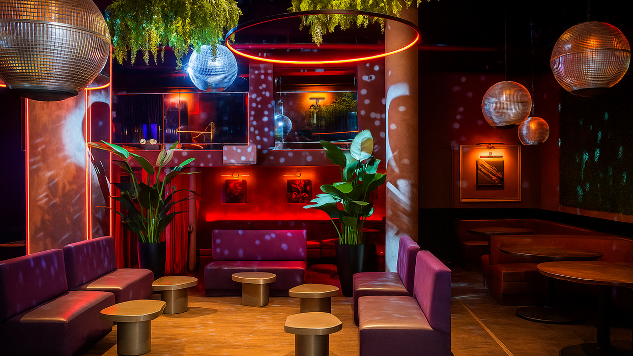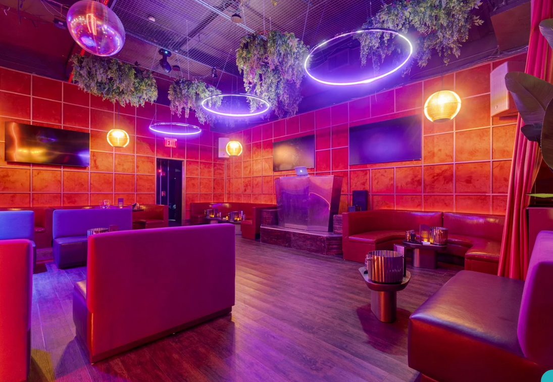 Ambient lighting, velvet textures, and immersive decor throughout the space